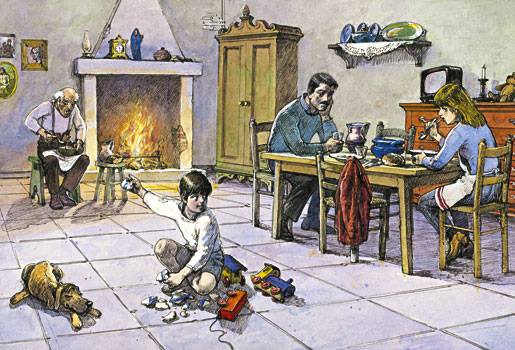 Il figlio e la nuora provavano disgusto, perciò costringevano il vecchio a sedersi nell’angolo dietro la stufa e gli davano da mangiare in una brutta ciotola di terracotta. Il poveretto guardava sconsolato il loro tavolo, con gli occhi lucidi.