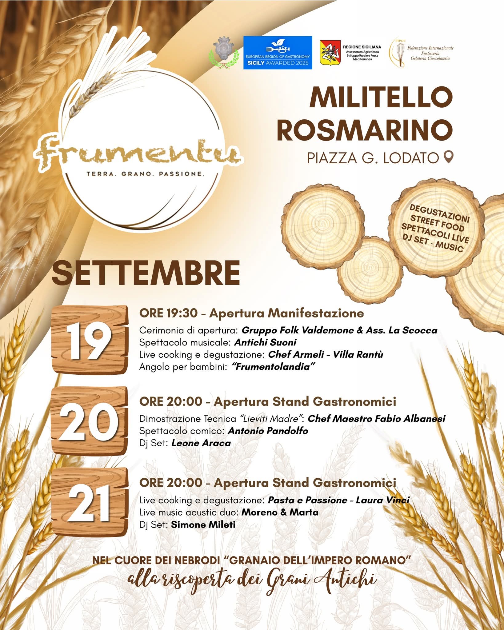 Saranno illustrate le tecniche tradizionali di coltivazione e trasformazione, insieme alla storia dei grani antichi, tornati a occupare un ruolo di rilievo nelle coltivazioni siciliane dopo un lungo periodo di marginalità. L’iniziativa intende far conoscere le varietà di frumento che resero la Sicilia “granaio del Mediterraneo”, mettendone in evidenza le proprietà nutrizionali, la biodiversità e il legame con il territorio.